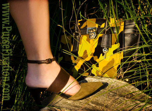 This Michael Kors Hamilton Traveler Camouflage Hair Calf satchel (similar, similar) is a killer: a perfect example of the luxurious camo statement. Chic blend of genuine haircalf and posh leather combined with plush camo print in a dominating explosive acid yellow strikes with sophistication. Add the elegant trapeze silhouette, easy carrying versatility, deluxe MK logo details and you have a glam bomb with its only connection to the weapon being an impactful effect it generates on passersby.