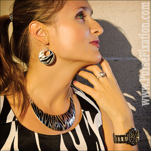 To spotlight the zebra dazzle even more, I picked the Style & Co collar, earring and bracelet set (similar necklace, similar earrings, similar bracelet) featuring the textured zebra pattern overlaying the silver-tone surface that shines in the shimmering light of the setting sun. The silver-tone ring (Avon, similar, similar) with the rectangular crystal stone adds the sparkle to the luminous spectacle. With its poetry of black and shiny lines of crystals, the other ring (Style & Co, similar) marries the dazzling zebra to live happily ever after in this graphic story.